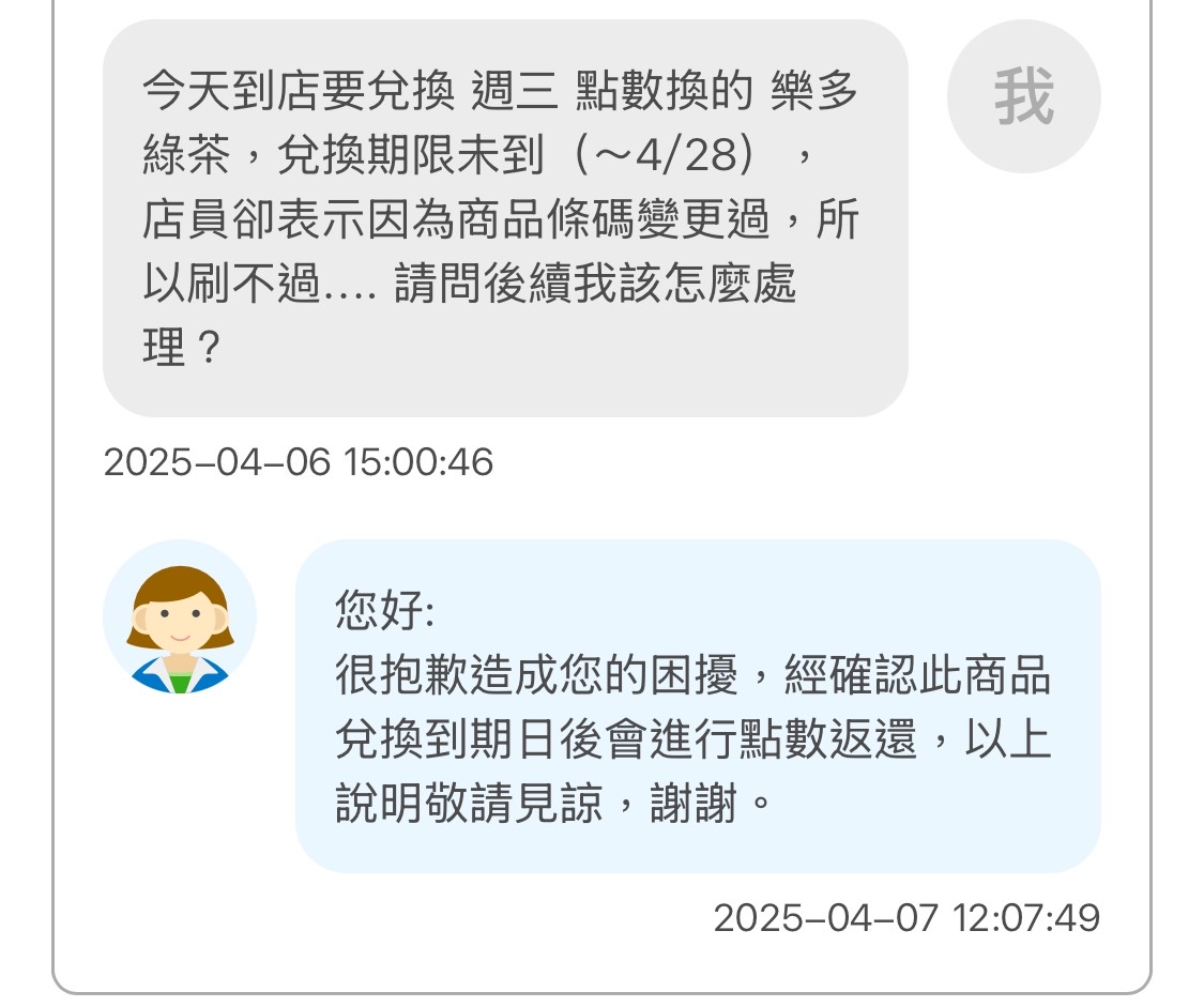 → imrt: 寫反應給全家公司並強調我不接受只退點數,卻仍然只得到「 04/05 02:36