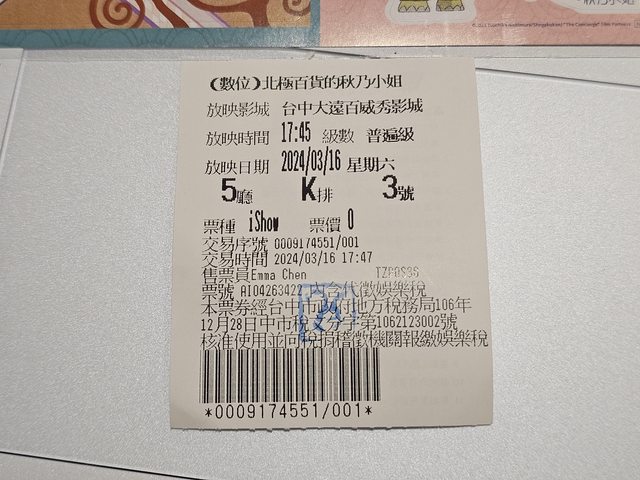 ▲《北極百貨的秋乃小姐》票根