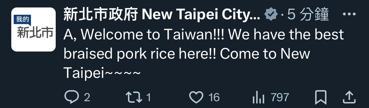 → sarsman: 市府小編忘記切帳號的話不會講 "come to new taipei" 吧 03/19 11:55