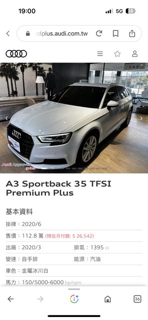 標題[售車] 2020 Audi A3 35 TFSI Sportback premium