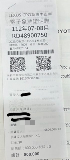 2023/8/28 於台南Lexus CPO 購入,購入價格為80萬元整(上面有發票證明),到我手上