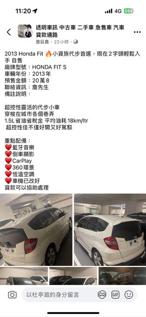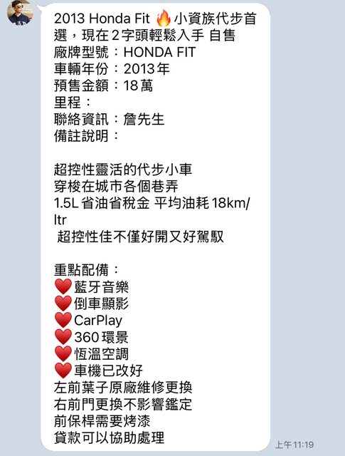 因朋友沒有PPT帳號 協助代Po 因二手車行報價太爛,所以使用文案在網路上自售 但引來許多車行收購 希望真正賣給想要買自售的 FB開價20.8萬 車版車友價格:18萬 台中 監理站約過戶 意者私訓 Line ID: v235698 --