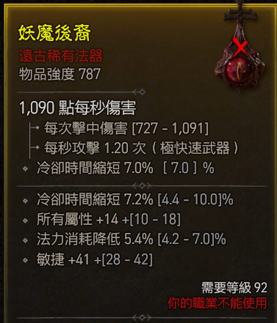 冷卻時間縮短7.2% / 所有屬性14 / 法力消耗降低5.4% / 敏41