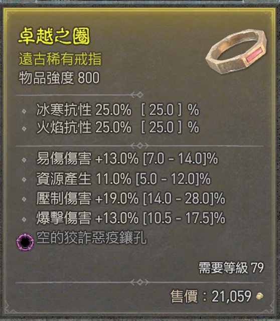物  品:79等戒指 易傷13% 資源11% 壓制19% 爆擊13% 狡詐孔 https://i.imgur.com/hapCsEe.jpg