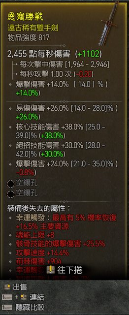 標題[競標] D4 S1 817雙手劍 高易傷核心 爆傷 80等