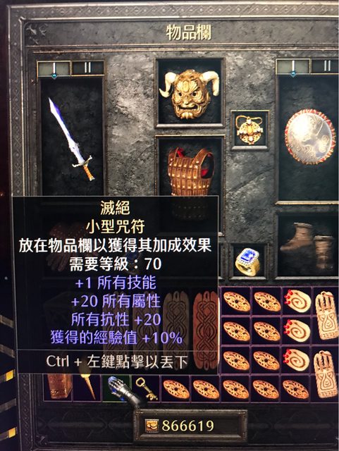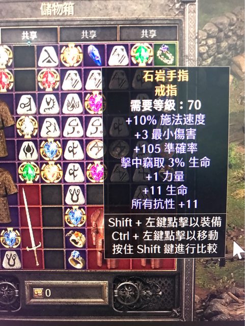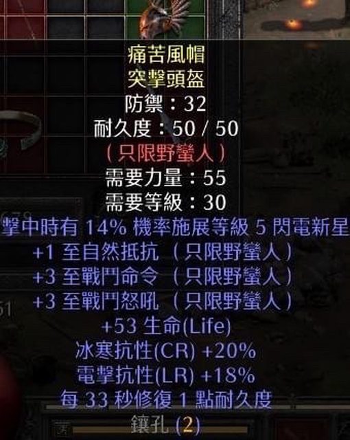 擊中8%-14%施展等級3連鎖閃電或其他技能項鍊、+2野蠻技能、10+力、10+全抗。