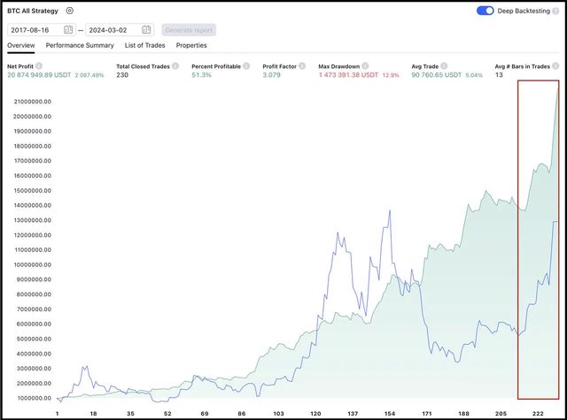 如圖,這套策略在過去 6 年半的盈利為 2087.49%,勝率為 51.3%,最大回撤僅為 12.9%