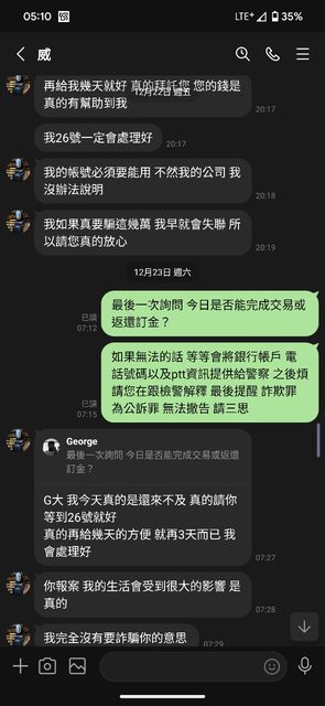 推 BrandonMai: 絕對就是詐騙啦 急需用錢還一直拖 12/26 11:25
