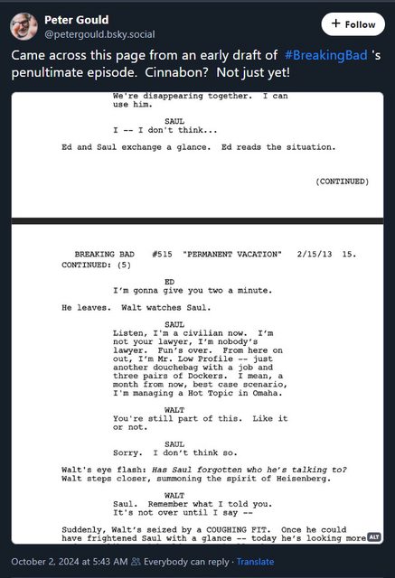 據報導,近日彼得 古爾德在《Bluesky》上分享了一則關於《絕命毒師》倒數第二集劇本