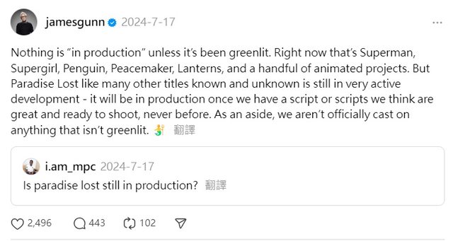 當時,他確認《Paradise Lost》處於「積極開發中」,但澄清尚未正式獲得開綠燈。