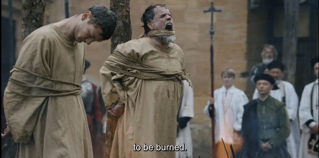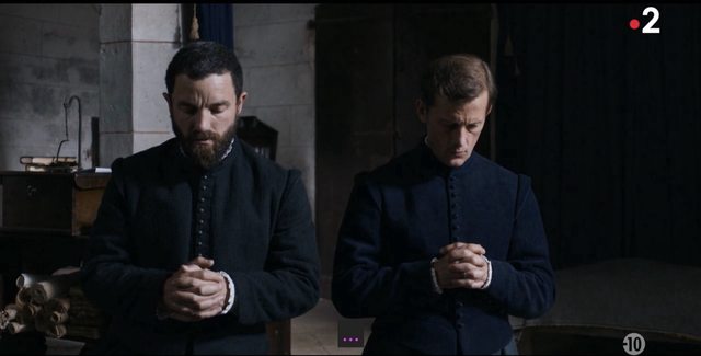 最糟的是即使「宗教信仰」沒露馬腳更沒礙著任何人,但正如宗教說穿了也不過就是統治者的神權建構、宗教信仰應信哪家哪派說穿了也不過就是個幌子,真正兵家必爭的還是「權力」與「利益」、就搭上「宗教戰爭」這順風車來場權力競逐與財產侵吞!E01 率先登場的兩位反派就代表兩種不同的「宗教意識」:隔鄰的傳統貴族領主 Fontenac 早看他們 Siorac 家靠戰功得到封地而忿忿不平、當今「宗教檢查」正風聲鶴唳剛好來見縫插針、只要來點「捕風捉影」「買通構陷」甚至「屈打成招」管他信什麼都能扣上「胡格諾」大帽!未來地產財富奴僕女人 (!)都落他囊中...