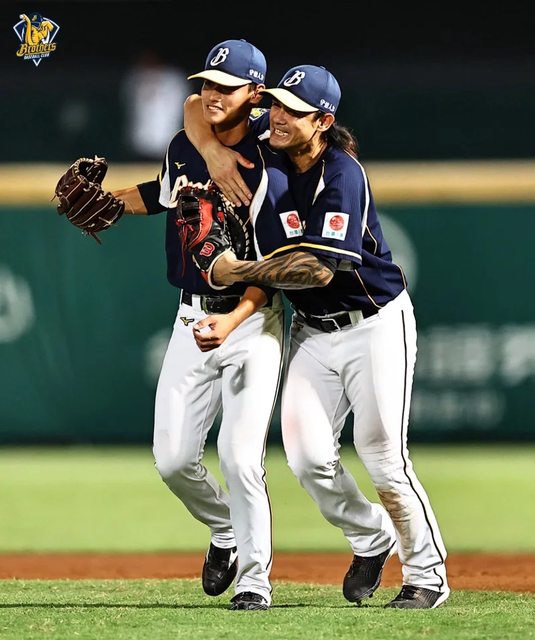 用手套輕拍他的頭,肩並肩、笑咪咪跑回休息室,對這位小17歲的表弟互動溢滿疼愛。