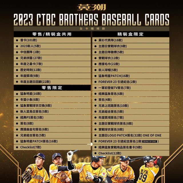 普卡101款、2023新人5款、中信團隊卡2款、兄弟拼圖卡27款、年度之最7款、歷史時刻卡12