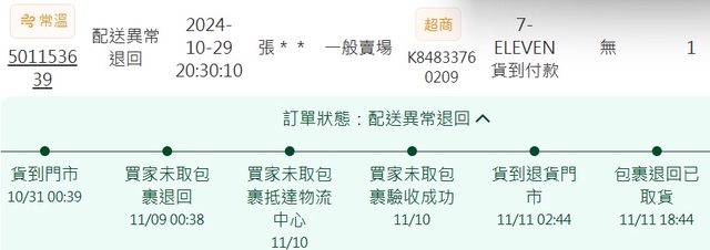 標題[黑單] Emilychang 超商未取貨退回