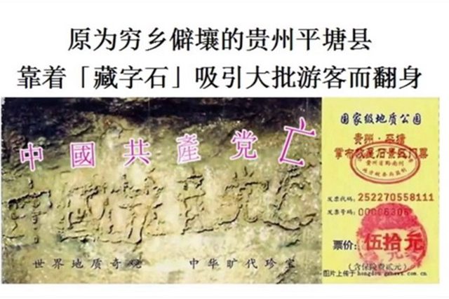深灰色岩中,石上六個大字「中國共產黨亡」,可謂是「天滅中共」、天意使然,