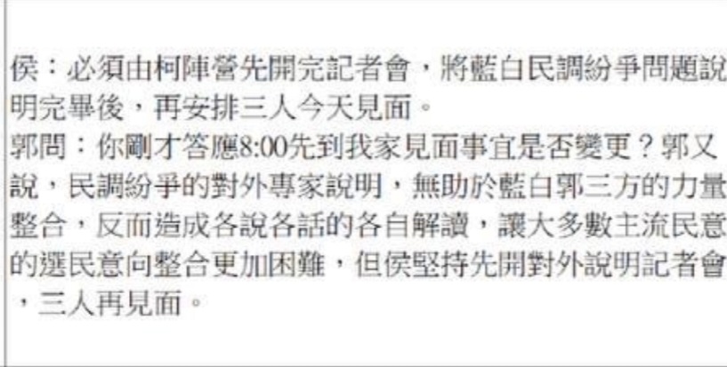 → t21: 看不懂喔。侯友宜的意思就是100%侯柯配才會談 101.136.22.92 11/22 20:19
