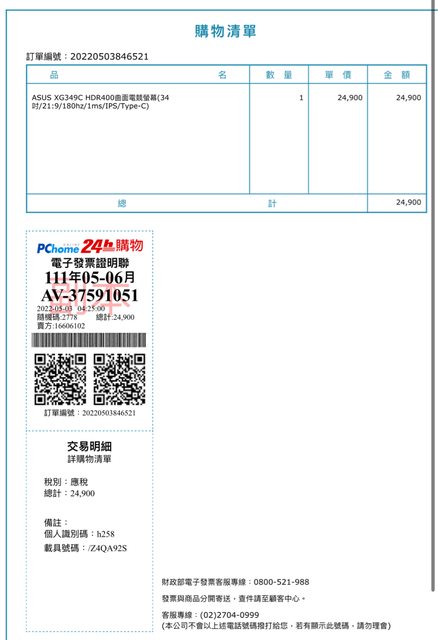 1. 2022.5.3自PC home購入,保固到2025.5.2
