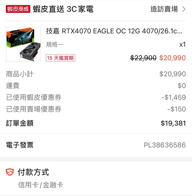 顯示卡:技嘉4070 eagle oc 2023/6/26開始五年保固