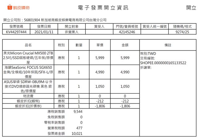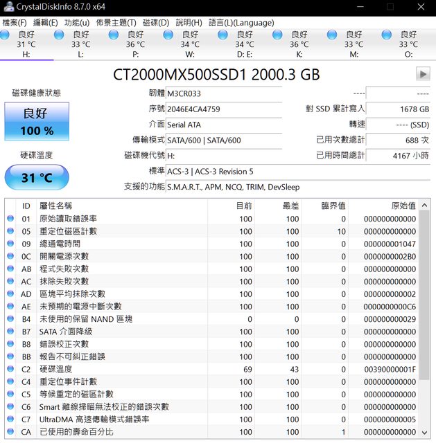 標題[賣/全國/皆可] MX500 2TB 2021購入