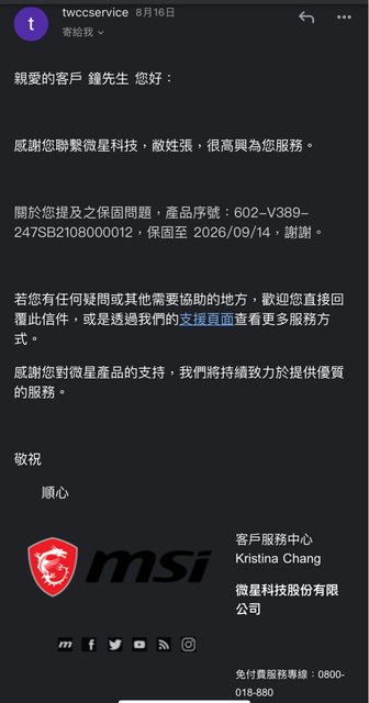 微星客服確認保固到2026/09/14