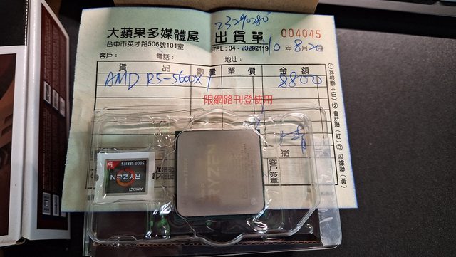 5600X 2021年8/20台中Nova大蘋果購買,會附上購買證明。盒裝完整,原廠散熱器未使用