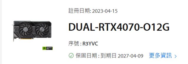 ◎硬體型號: (禁止販售未拆封之物品,贈品、獎品、RMA品、電腦相關線材及耗材除外) asus RTX4070 DUAL 黑色 12GB GDDR6X版 ◎欲售價格: (沒有明確價格、賣出後清空價格:水桶2m,售價高於原價:水桶1y+退文) $17000 ◎品樣狀況: (請詳述 1.購買日期 2.保固有無 3.使用狀況 4.配件完整性) 近全新 盒裝完整 功能正常 保固到2027-04-09 ◎佐證資料: (請附上 1.實物照片 2.購入或保固證明) https://i.imgur.com/hCZXqaV.jpeg