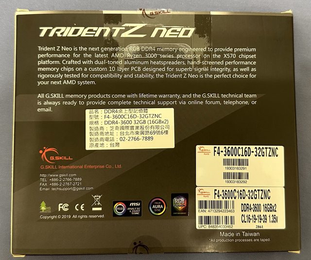 2. 芝奇 Trident Z Neo DDR4-3200 16GB*2 (F4-3600C16D-32GTZNC)