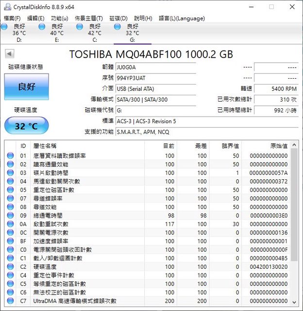1. Toshiba 2.5吋 5400rpm 1TB HDD (MQ04ABF100)