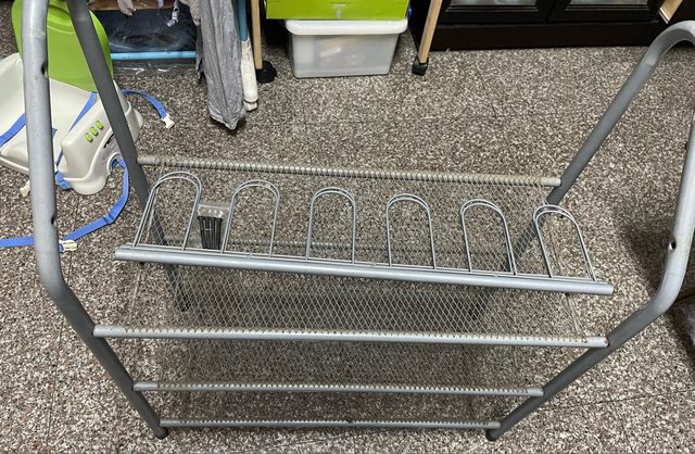 鐵製的還蠻穩固的,不會搖晃。上層立式置物架已拆。久放有灰塵需再細清,鐵管有點生
