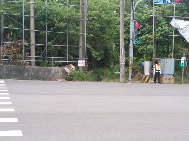 : 號誌燈下面草皮樹叢一帶