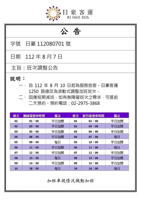 業者說明,日豪客運1250路線會滾動式調整加班班次,視情況機動加班,旅客如有無障礙