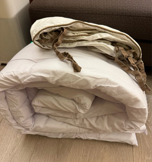 去囉!床圍心狀態還不錯,套子有使用痕跡,綁帶有斷掉一兩條但不影響使用。