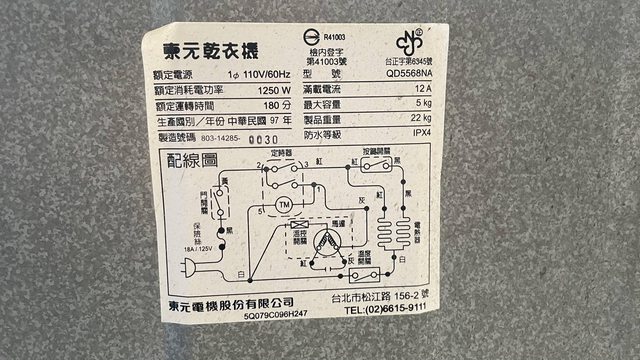 物品項目:堪用東元烘衣機