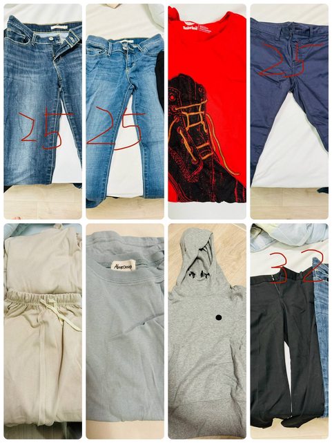 物品項目:若干件女生洋裝及褲子、一件Timberland XS t-shirt、一件Timberland S帽T、一件 Timberland S大學T