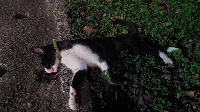 下班路過看到賓士貓貓被路殺了,看起來是被移動到草皮的。