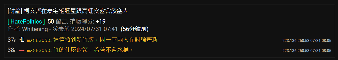推 percy921 : 當然是關心新竹啊,不能批評高市長喔,會被關10年的 07/31 09:10