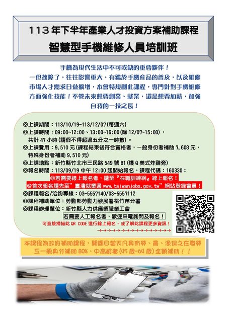 【113下~在職補助課程分享~智慧型手機維修人員培訓班】9/19中午12點起開放報名!