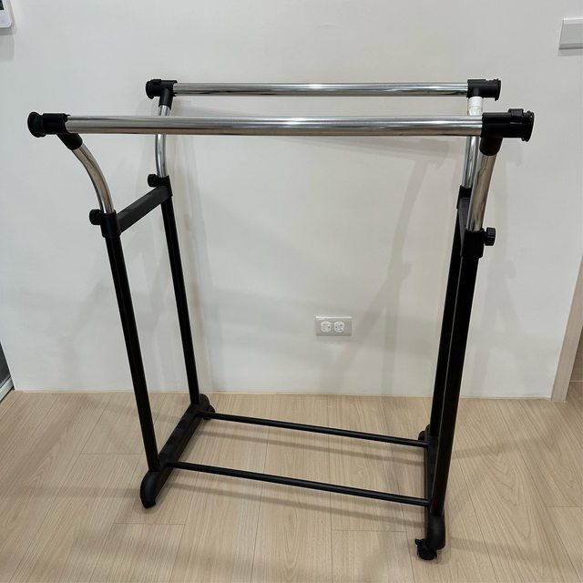 (兩排的吊桿 左右可以延伸長度 可曬很多衣服 很好用 有一處的塑膠裂開 已貼膠帶固定 不影響使用)