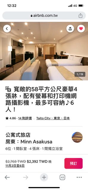 → Chrisia : 或者直上四人房的飯店吧 攜家帶眷的住民宿或airbnb 08/10 15:23