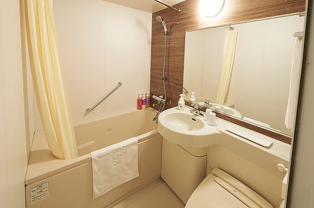 飯店浴室是日本常見塑膠箱體的整體浴室,內有浴缸、馬桶、洗臉台。