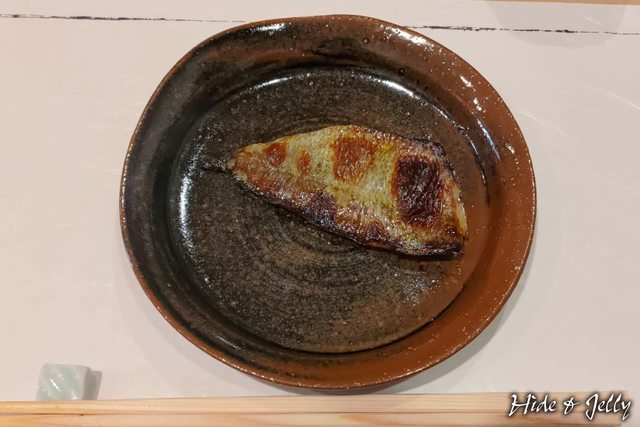 主菜的烤魚,魚皮刷上淡淡的味噌烤的略脆,魚肉相當緊實,絕對不是鯖魚,主廚有說魚