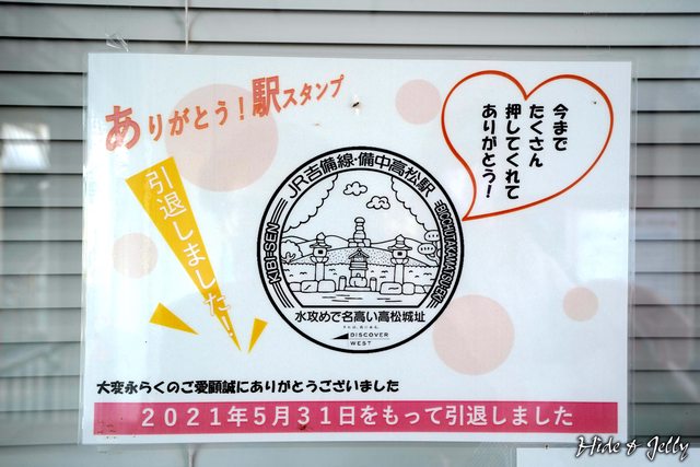 車站的印章,是以備中高松城內的清水宗治首塚為構圖,只是...他引退了(崩潰
