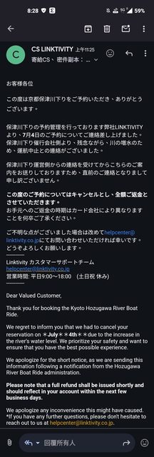 如標題,今天下午官方和網路預定平台都來信通知取消,本來想改搭屋形船但找了官網發現