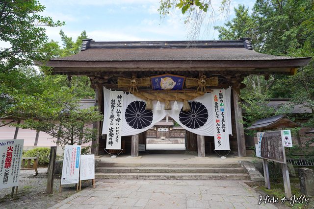 爬上階梯就可以看到前方的本宮大社神門了,右邊則是授与所,御守、繪馬、籤詩都可以