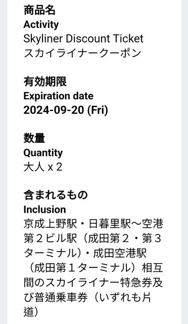 skyliner 單程票 大人x2