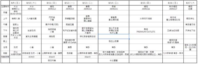 : 預計8/9-8/17去北九州及廣島(強碰山之日與盂蘭盆節QQ),共兩人。