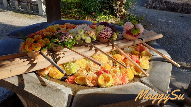 不得不說,光明寺的楓葉真的有它的美。就連平時不愛拍照的媽媽也選了花手水旁的這顆鮮紅楓葉當背景,留下與爸爸一起的楓葉合照。今年因為較熱的原因,楓葉有較晚轉紅,所以我們去的時候還未完全見頃,但也因此欣賞到了紅橘黃綠交錯的楓景,反而顯得更有層次,另有一番風味。由於篇幅的關係只能放上幾張照片讓大家欣賞,實際上我在這拍攝的照片可是費了我手機好多的內存呢(笑) 照片皆為手機內建相機拍攝,沒有使用濾鏡或修圖。