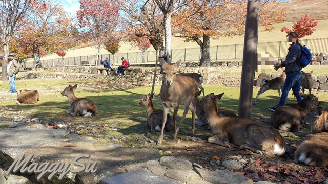 第一次來奈良的媽媽看到這麼多鹿覺得很新奇,在若草山麓或春日大社附近的鹿對鹿餅比
