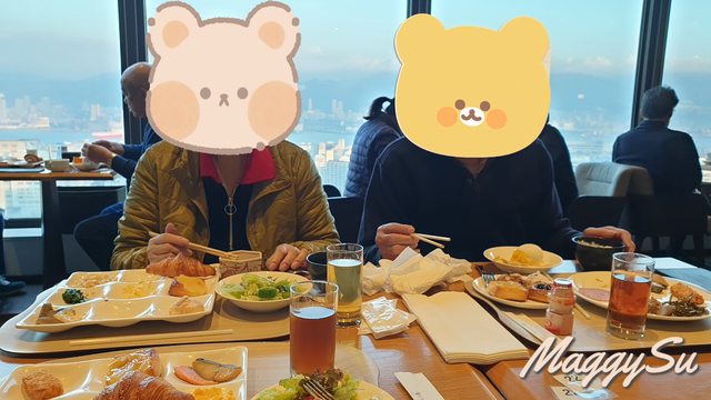 這天早上我們到30樓的景觀餐廳GOCOCU用餐,服務人員都會優先安排靠窗的區域,感覺很貼心。這邊同樣是buffet型式,品項也很多,餐點都蠻好吃的,尤其是九宮格最上面中間的那個蘋果派,我吃完還再續了一個,明明平常我是不太愛吃派類的。難道是心情愉悅加持的關係嗎?XD 爸媽對這頓早餐也是相當滿意,媽媽還嘗試了餐廳現打的青汁,她看到很多人都在喝也去拿了一杯,結果意外的大受好評。能幫助消化又合胃口真是太好了。