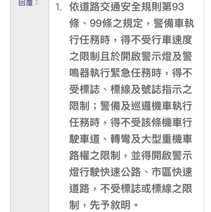 → hantulee : 警察有特權,不能以一般交通規則限制 10/13 10:39